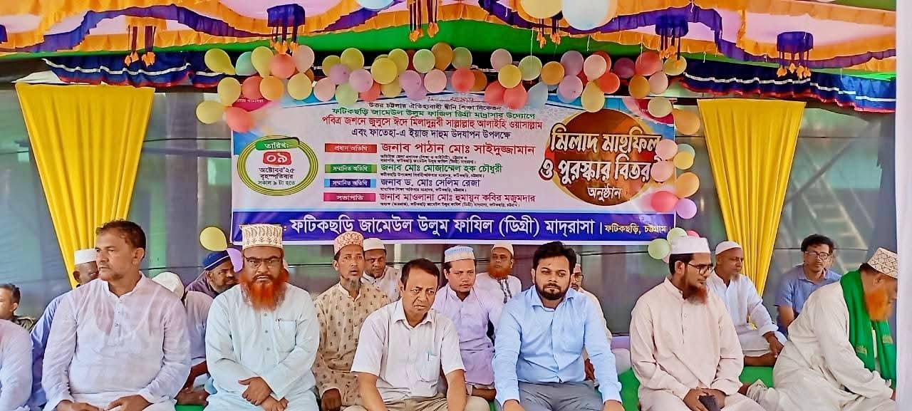 ফটিকছড়ির ঐতিহ্যবাহী দ্বীনি শিক্ষা প্রতিষ্ঠান ফটিকছড়ি জামেউল উলুম ফাজিল ডিগ্রী মাদ্রাসার উদ্যোগে পবিত্র জশনে জুলুসে ঈদে মিলাদুন্নবী (সাঃ) ও ফাতেহা-এ ইয়াজ দাহুম উদযাপন উপলক্ষে মিলাদ মাহফিল ও পুরস্কার বিতরণ অনুষ্ঠান অনুষ্ঠিত হয়েছে।